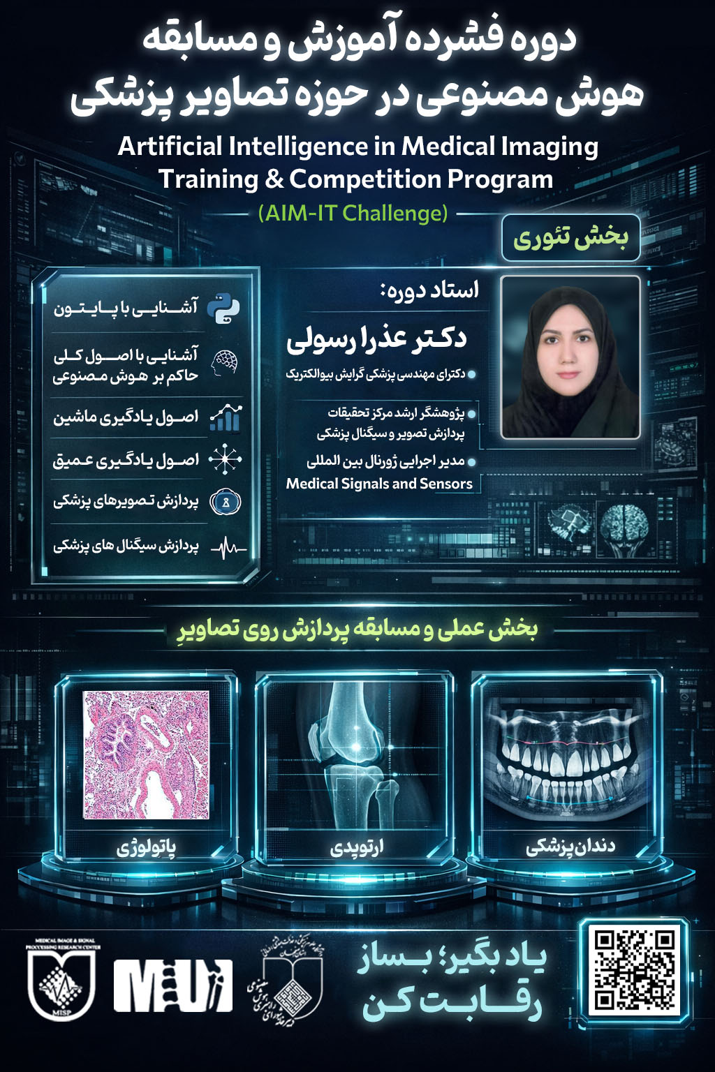 مرکز تحقیقات پردازش تصویر و سیگنال پزشکی با همکاری شورای راهبری هوش مصنوعی دانشگاه علوم پزشکی اصفهان، باهدف توانمندسازی پژوهشگران، دانشجویان، پزشکان و متخصصان حوزههای مهندسی و علوم زیستی، برنامهای جامع و ساختاریافته در زمینه هوش مصنوعی در تصاویر پزشکی طراحی کرده است. این برنامه آموزشی با رویکردی مرحلهبهمرحله، از آموزش مبانی برنامهنویسی آغاز شده و تا پیادهسازی مدلهای پیشرفته یادگیری عمیق و ارزیابی آنها در دادههای واقعی پزشکی پیش میرود. در نهایت، با برگزاری یک مسابقه گروهی دانش و مهارت عملی شرکتکنندگان بهصورت عملی مورد قضاوت قرار میگیرد. در ادامه، جزئیات برگزاری این دوره شرح داده میشود: